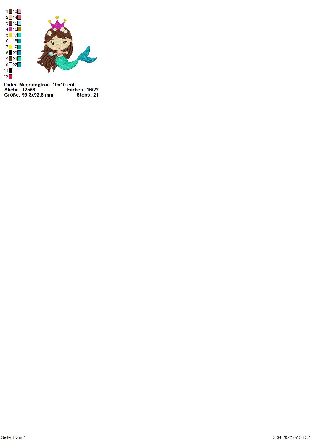 Stickdatei Meerjungfrau für den 10x10 cm Rahmen.