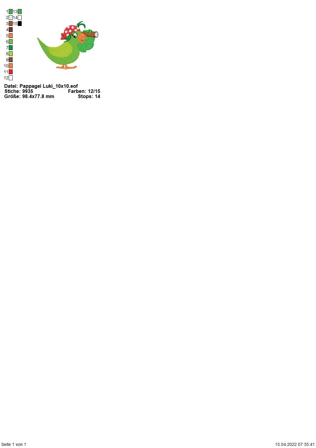 Stickdatei Papagei Luki für den 10x10 cm Rahmen.
