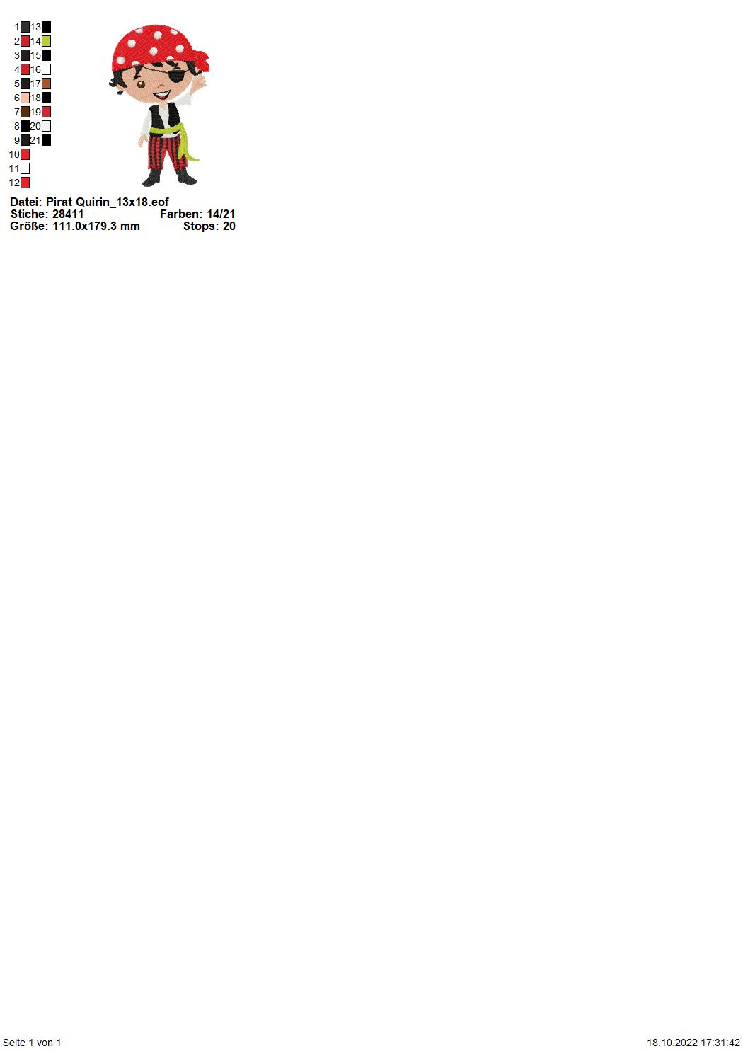 Stickdatei Pirat Quirin für den 13x18 cm Rahmen.