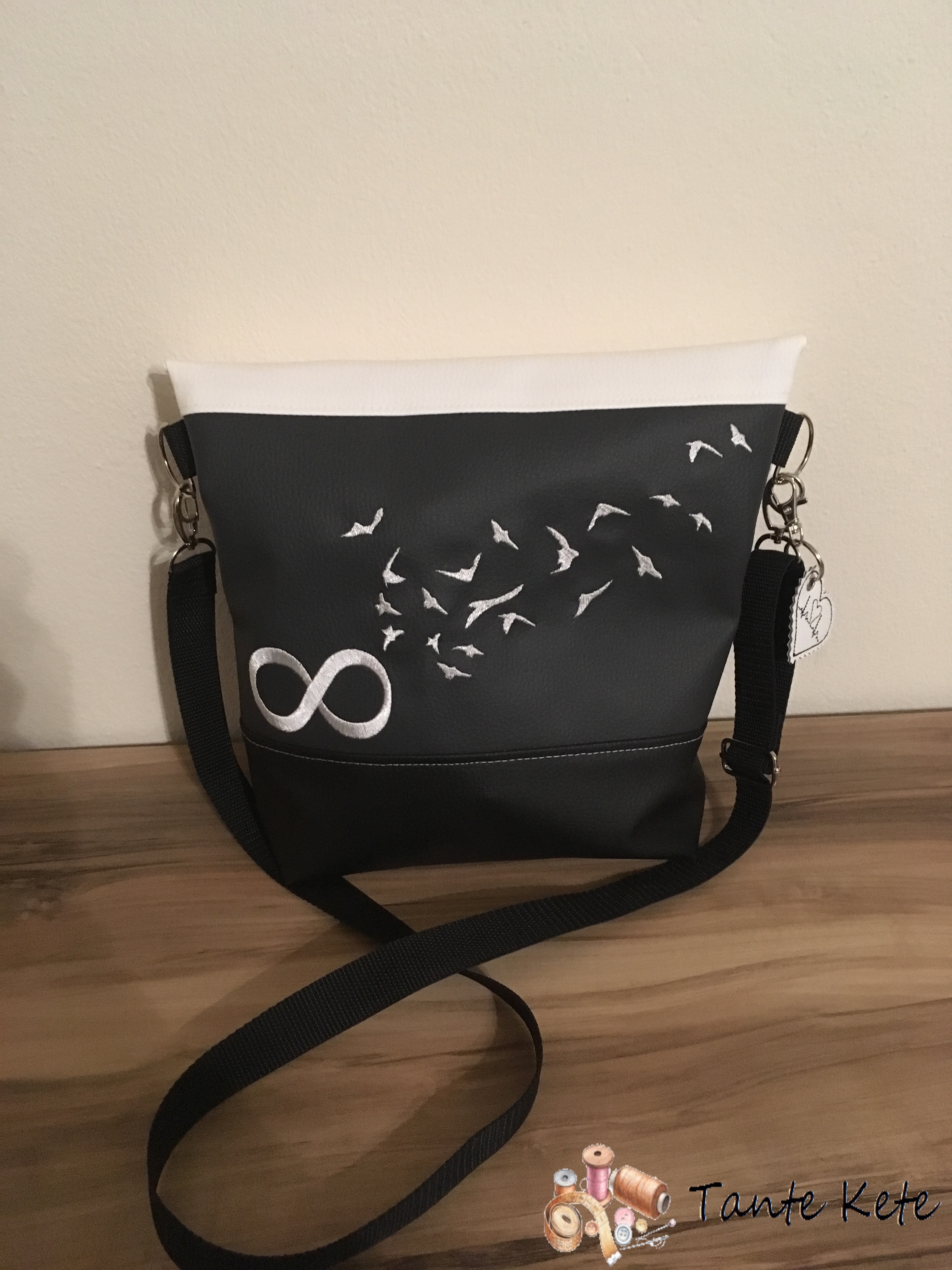 Umhängetasche "FoldOver" mit Stickerei Schwalben & Unendlichkeitszeichen